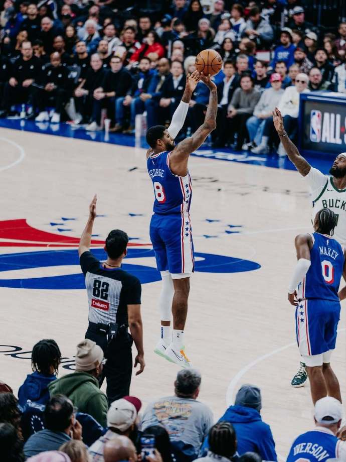 76人三巨头今天都非常给力,合砍83分。乔治发挥出色,打出赛季最佳一战,出战33分钟,投篮21中11,三分15中9,罚球2中1,砍下32分5篮板5助攻2抢断,正负值+13。第三节比赛,乔治单节独得16分。
