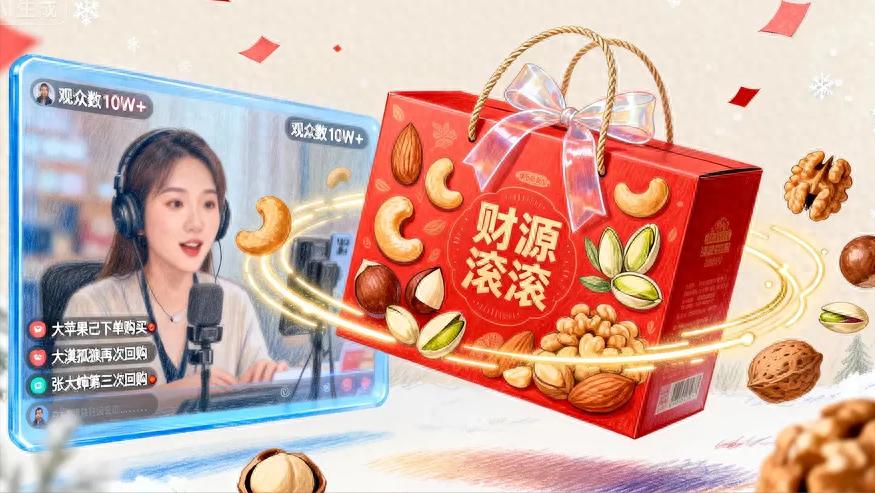 坚果只是直播间承载年味的其中一个缩影。除了食饮,服装配饰、文创产品以及老字号等众多国货品牌都是年货节的重要供给,人与人之间的情感连接引擎。