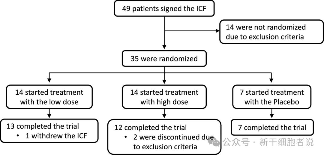 这项随机、双盲、安慰剂对照临床试验共纳入了35例患者,按2:2:1的比例分为三组。在11个月内,三组患者分别通过9次静脉输注,接受了剂量为100万细胞/kg的hDPSC治疗、200万细胞/kg的hDPSC治疗、安慰剂治疗。
