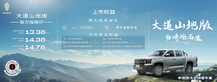 江铃大道山地版还带来了涵盖10000元增换购、2年金融免息等至高17000元的综合优惠,以及发动机终身质保、变速箱终身质保、购车首年内四次上门免费取车或送车服务等六大车主权益,预定大道山地扬帆版的用户还可获得国家队同款定制服装及限定荣誉证书,能赋予用户奥运健儿的专属荣耀感。