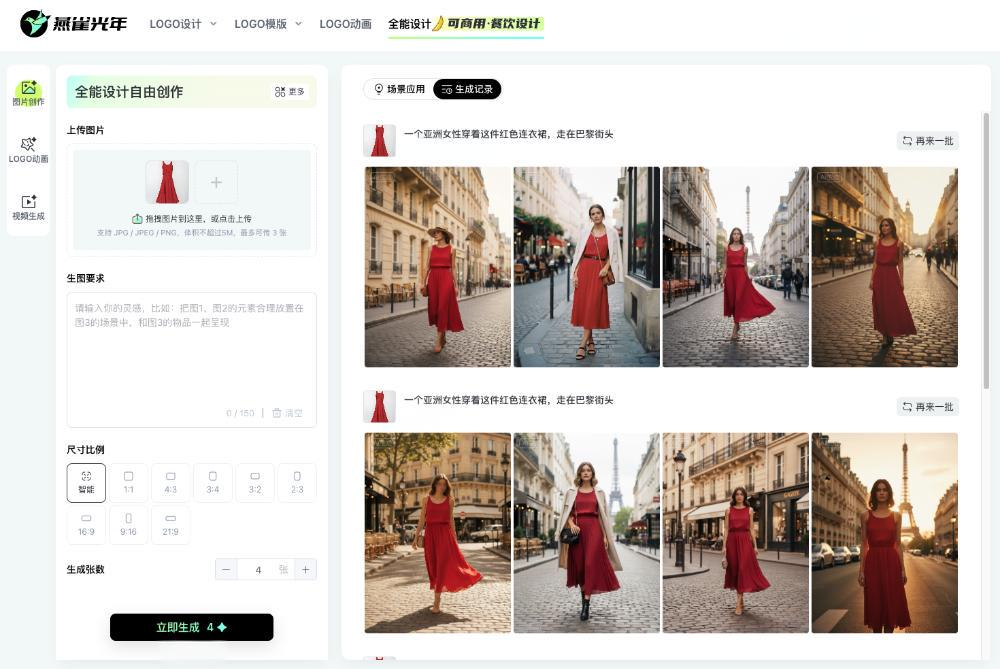 一、什么是「全能设计」?告别复杂,拥抱无限可能燕雀光年的「全能设计」是一款划时代的AI生成设计工具。它的核心功能简单到令人难以置信:你只需上传几张自己的图片(例如产品图、模特图、参考风格图),再输入一句简单的描述(提示词),AI就能在几秒钟内为你生成一张全新的、符合你所有要求的、商业级品质的图片 。