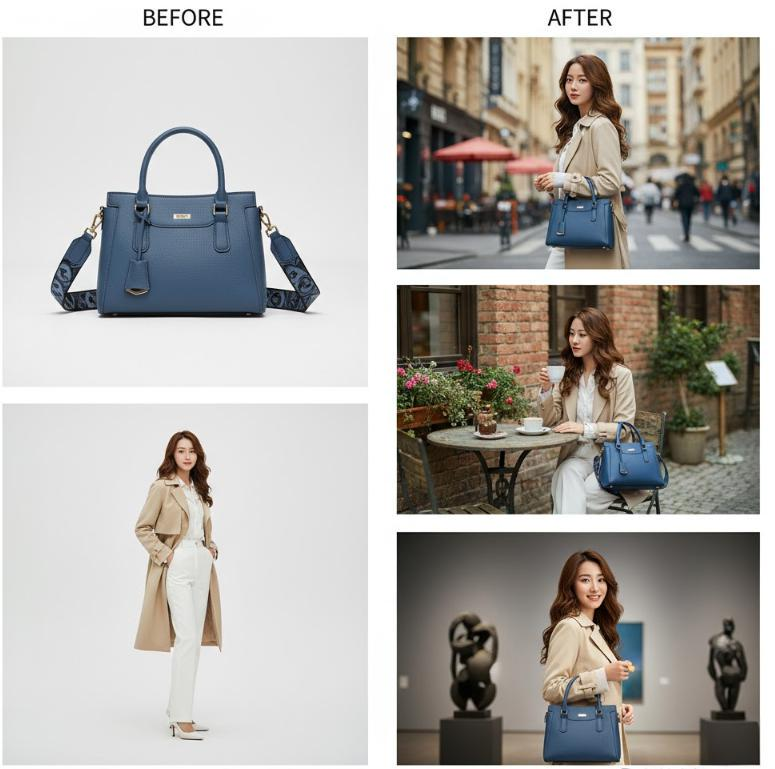 「全能设计」解决方案: 你只需要一张产品图和一张(或多张)任何模特的照片。在「全能设计」中,输入提示词“模特手持这款蓝色手提包,在都市街头背景下”,AI就能瞬间生成一张模特自然手持你的产品的逼真照片。你可以随心所欲地更换模特的种族、发型、姿势,直到找到最符合你品牌调性的形象 。