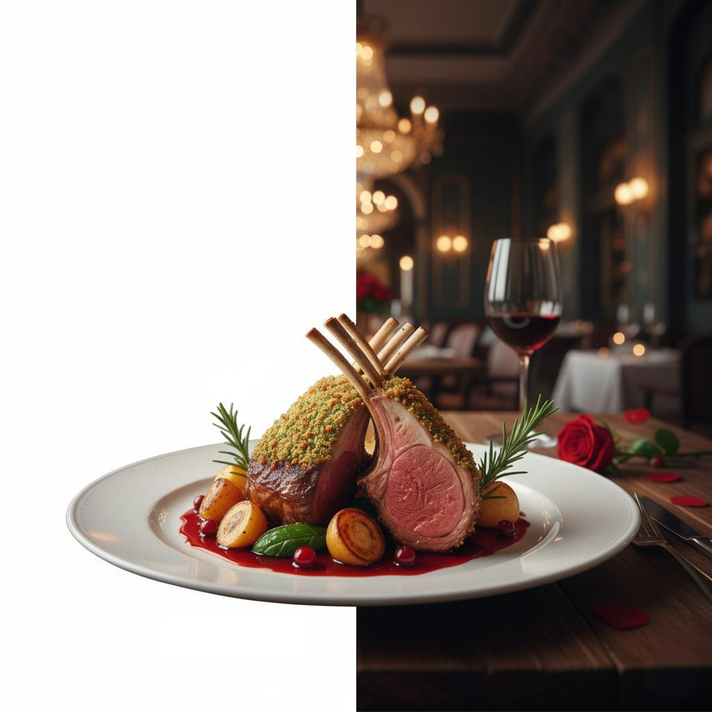 餐饮行业: 上传你的菜品照片,让AI为它搭配一个高档餐厅的背景,或者生成一张节日氛围(如圣诞节、情人节)的宣传海报,让你的菜品在视觉上先声夺人。