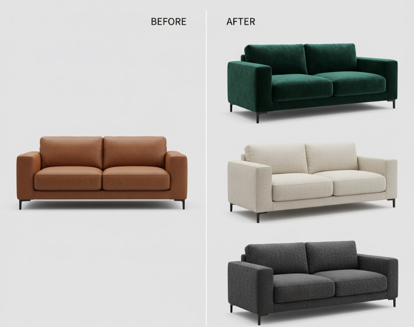 「全能设计」解决方案: 这绝对是电商卖家的福音!上传你的主打款产品图,例如一个皮质沙发。然后,你可以通过简单的提示词“把沙发换成天鹅绒材质,颜色为墨绿色”,或者“换成亚麻布材质,米白色”。无需重新建模或拍照,几十种SKU的展示图瞬间完成,极大丰富了你的商品详情页。