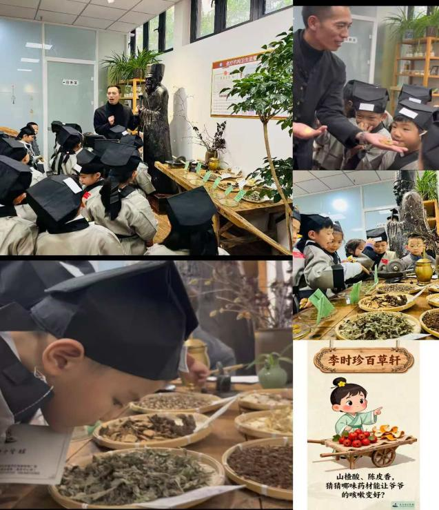 最后一站,孩子们见到了走遍千山万水的“药圣”李时珍。通过观看历史文物独轮车和各种药材标本,聆听了李时珍三十年著《本草纲目》的伟大历程。孩子们拿起放大镜,好奇地观察山楂、陈皮、甘草三种药材的独特“指纹”(纹路),闻辨气味。最后,纷纷模仿“药圣”李时珍的动作,背起竹筐弯腰“采药”、闻药、识药、捣药,品中药茶饮,顺利成为“本草探秘”侦探,盖上第三枚珍贵的印章。
