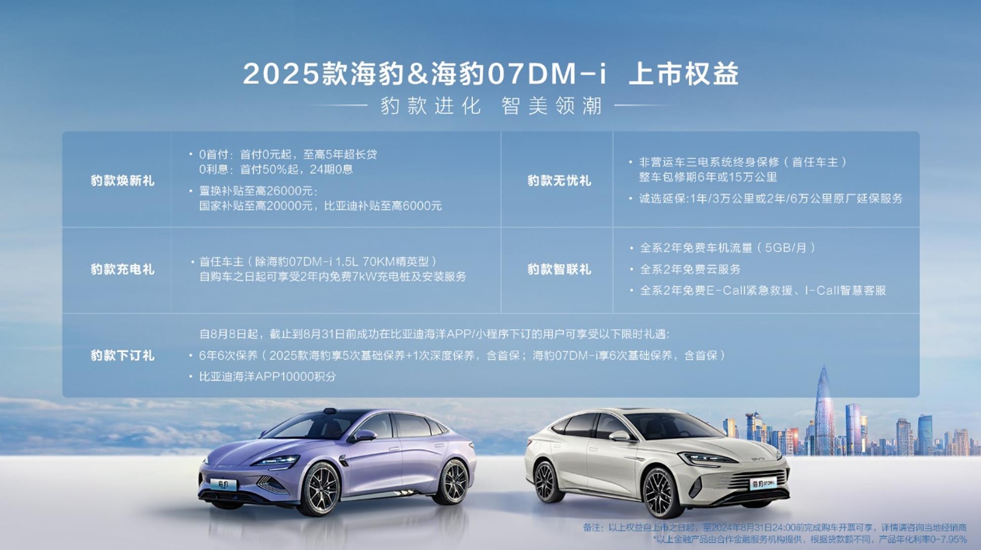 8月8日,比亚迪海洋网“双豹”齐发,2025款海豹、海豹07DM-i正式上市。此次“双豹”车型完成了e平台3.0 Evo和第五代DM两大全新技术升级,实现了从核心技术到效率、性能、智能、美学、舒享、安全等方面的全面跃升,为用户带来更好的用车体验和更高的产品价值。