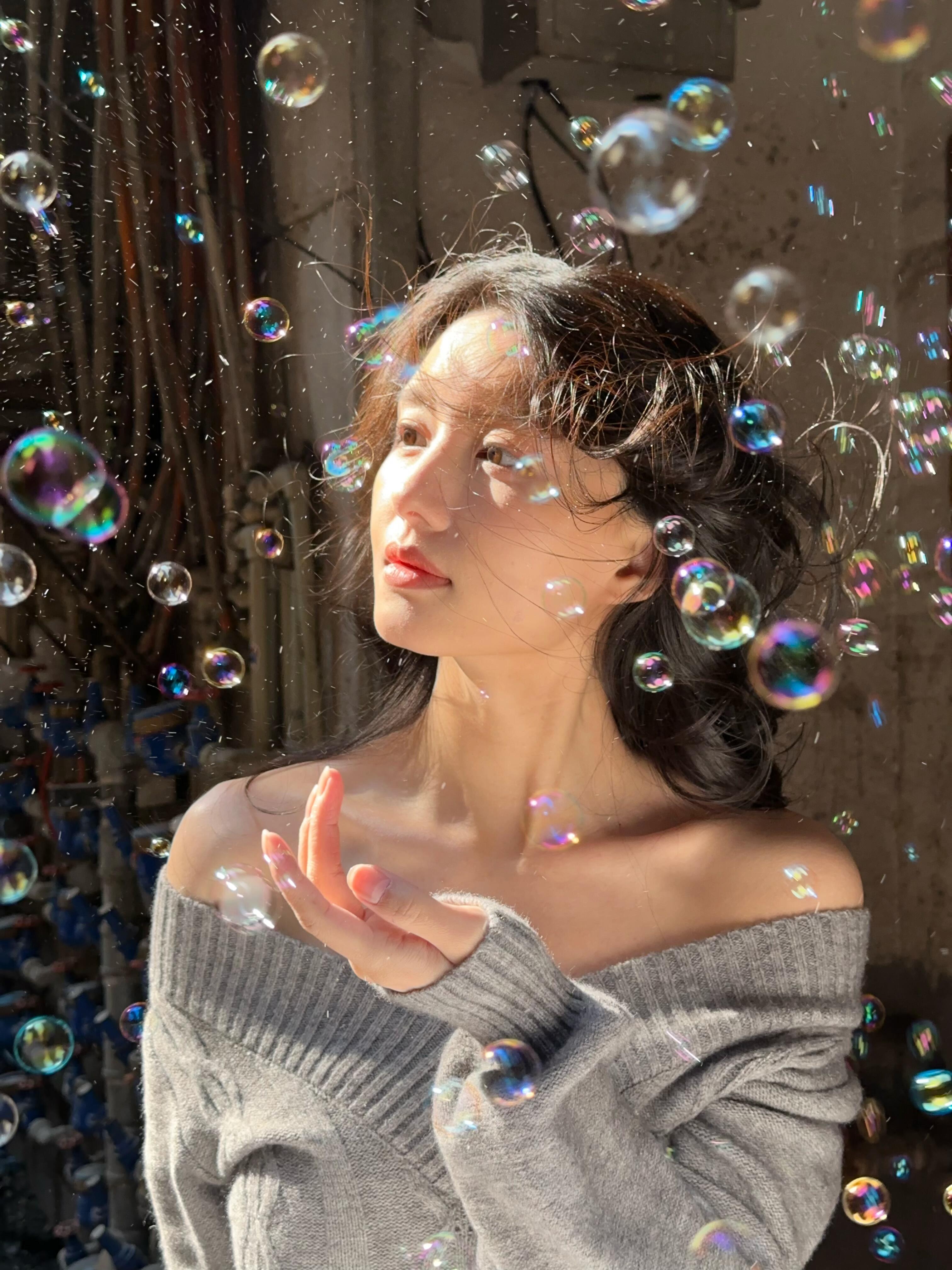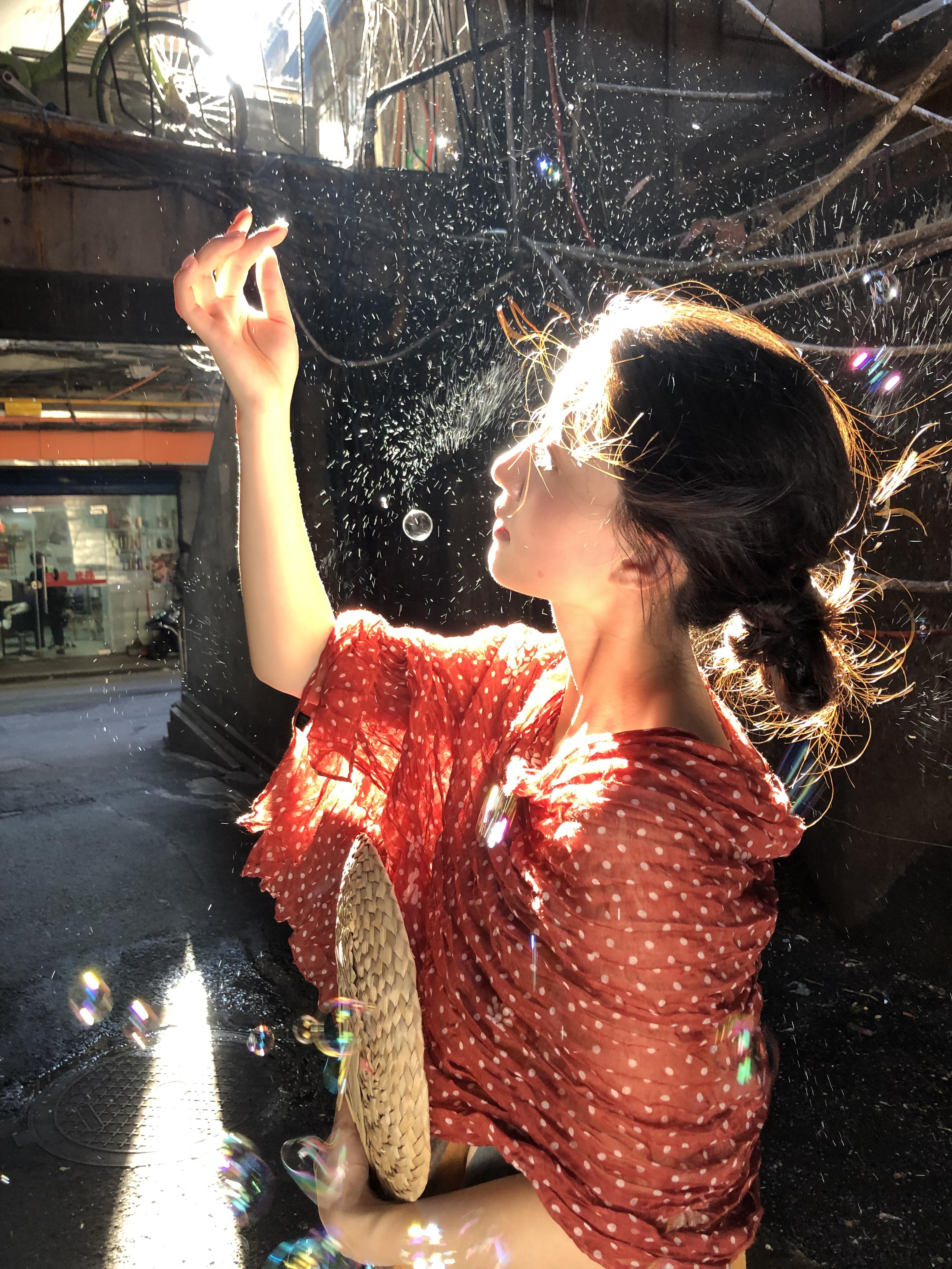 道具的选择可分为透光类与反光类两类,不同类型的道具与逆光结合会产生不同的视觉效果。透光类道具包括泡泡水、透明玻璃、薄纱丝巾等,逆光光线透过这类道具时,会形成光斑、折射光或光影纹理,为画面增添梦幻感。
