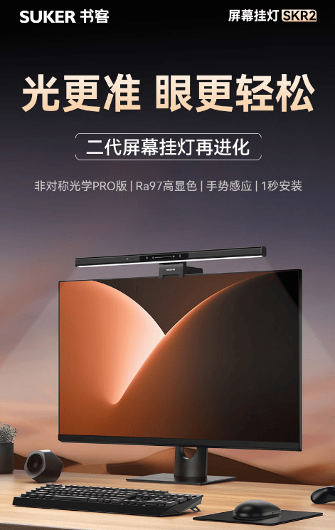 近期,屏幕照明领域迎来新品更新,SUKER书客发布了升级款屏幕挂灯skr2。该产品围绕显示设备使用场景,对光学结构与光源方案进行了系统性调整,重点解决屏幕反射、光线生硬及蓝光干扰等问题。