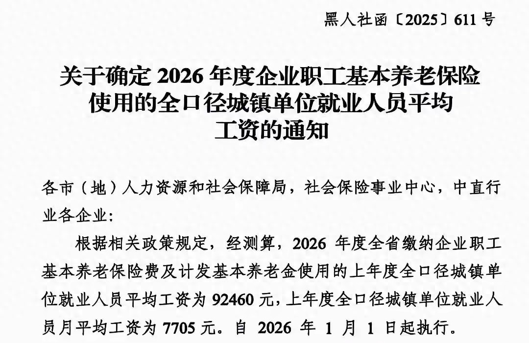 今天看到了一位朋友转发的黑龙江省人社厅公布的,2026年缴纳企业职工基本养老保险费和计发基本养老金使用的上年度全口径城镇单位就业人员社平工资为92460元,月平均工资为7705元。今年的这一工资水平比上年7750元增长了1.78%。