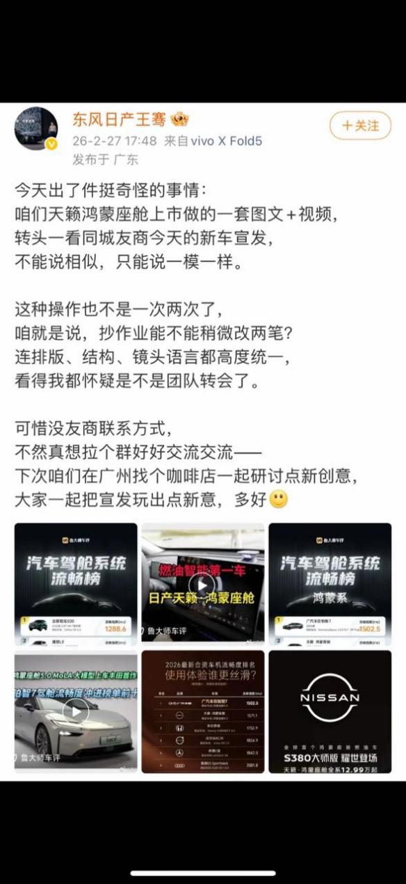我记得前几天还刷到东风日产的高管WB开炮广汽丰田的新车宣发物料,说和自家天籁鸿蒙座舱的图文、视频高度雷同,还吐槽"不能说相似,只能说一模一样 !