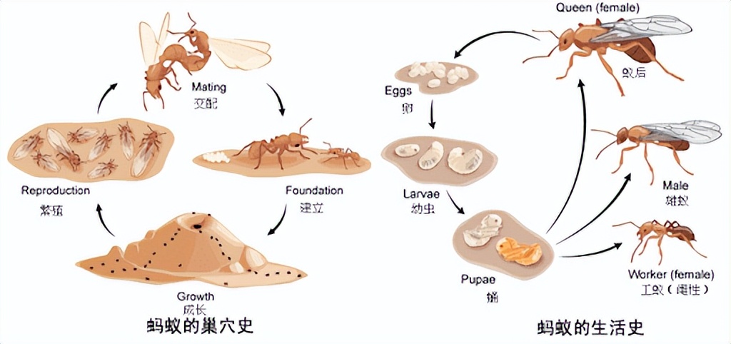 简单来说,一个蚁群中,蚁后负责产卵,雄蚁在交配后很快就会死亡,数量最多的雌性工蚁,则负责觅食和照顾幼蚁,有的物种还有兵蚁,行保护之责。