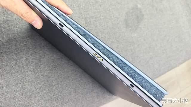 翻转机身到中框与后盖,Duet5的设计多了几分安卓平板的风格。一是中框的样式,熟悉的直角边金属材质,中框顶部是满布的散热孔,直接开在金属底层,没有像微软苏菲产品那样加凹槽,更加直观,也避免了灰尘堆积。二是中框的底部,是经典的磁吸附接口,与标配的磁吸附键盘搭配,一触即连,连接强度高,连接稳定,键盘操作流畅。三是中框左右区域,添加了共3个c口,一个耳机孔,没有标准的usb口,拓展坞肯定要后期配,便于公共共享内容。