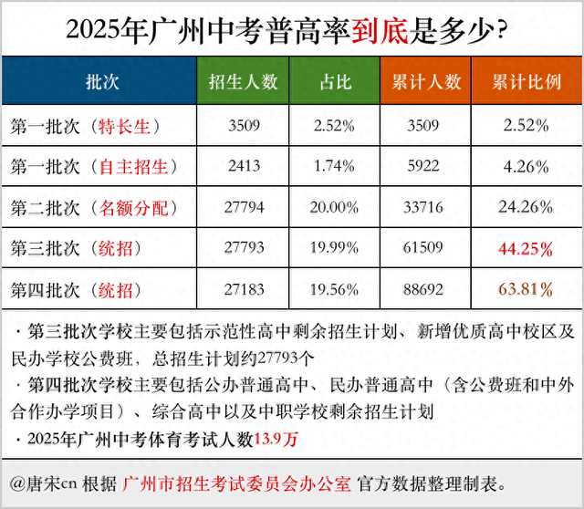 广州市教育局公布了2025年广州中考体育考试人数为13.9万人,小编以为这个数据作为分母是比较合适的。而广州市招生考试委员会办公室公布了2025年广州中考符合名额分配的考生数量为102785,许多自媒体把这个数据作为分母,得出来的结果自然要高出许多。小编以为以这个数据为分母是不合理的。