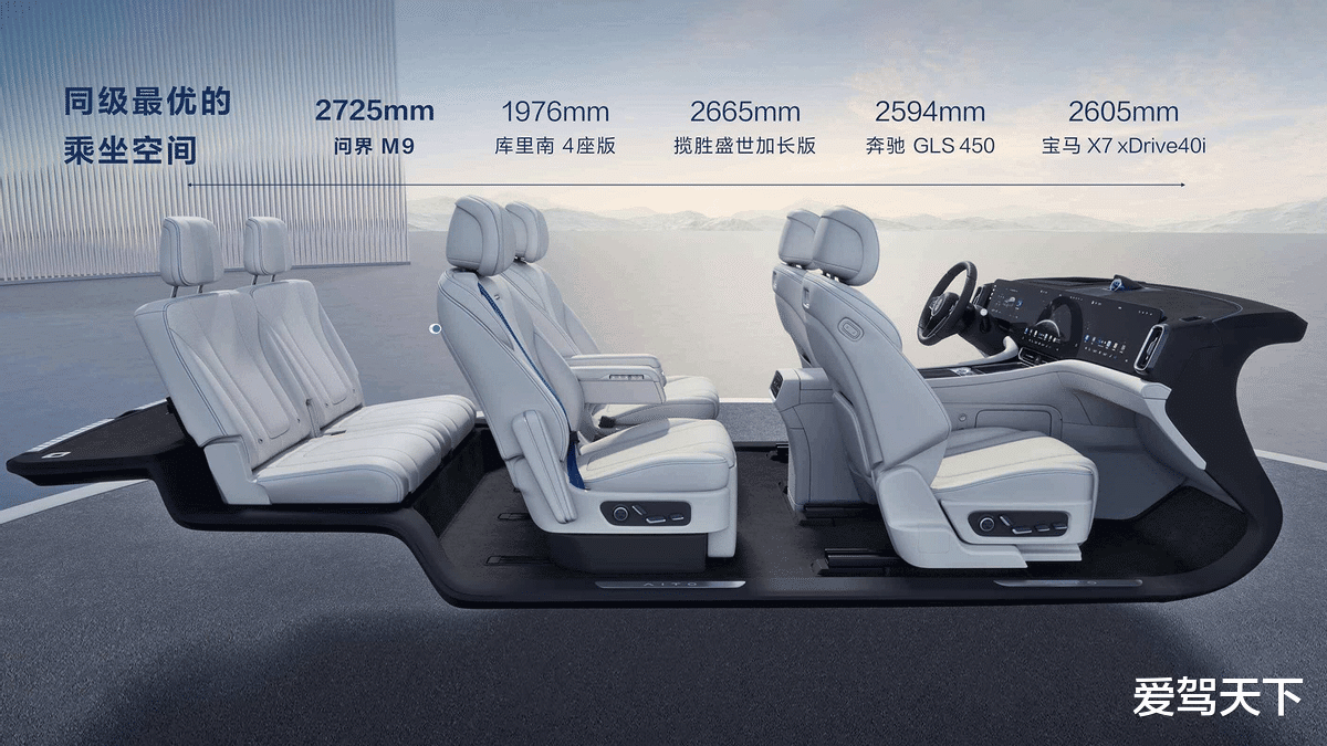 问界M9车身尺寸5230x1999x1800mm,轴距3110mm,相比极氪9X车身尺寸略小,但纵向空间宽敞,三排座椅间距均匀,六座版满载6人时也无明显拥挤感,第三排腿部空间达950mm,还实现了MPV级纯平地板,让后排进出更便捷。