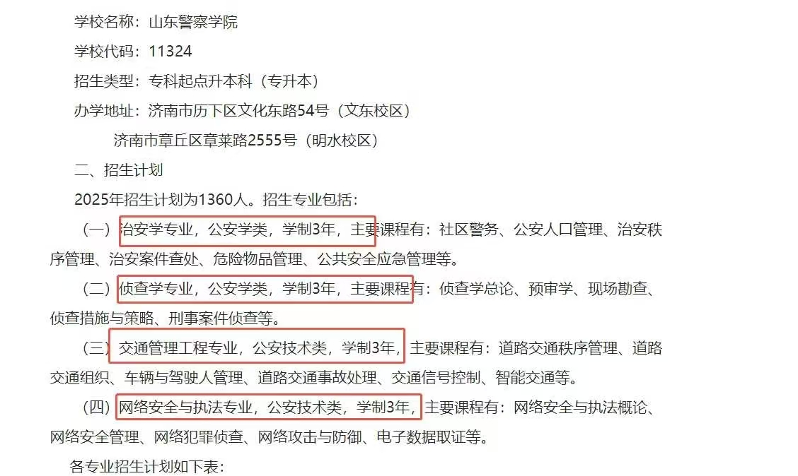 专升本赛道迎来重大变革!山东警察学院——2025年专升本招生计划明确标注学制3年,涵盖治安学、侦查学、交通管理工程、网络安全与执法四大公安特色专业,总计划1360人,文东、明水双校区同步推进。