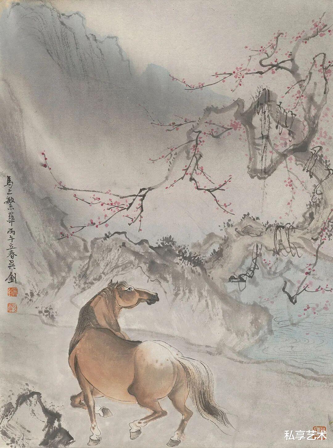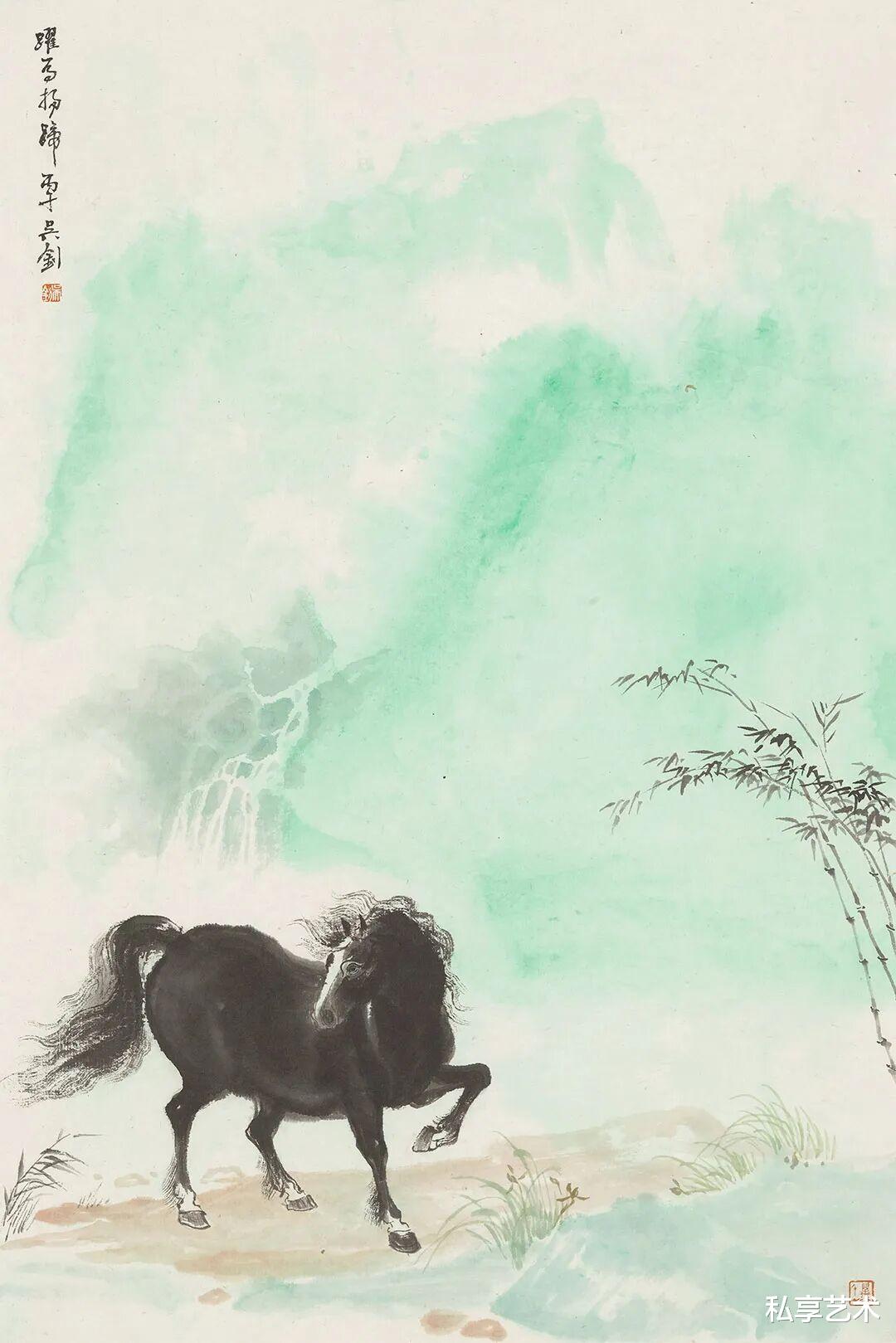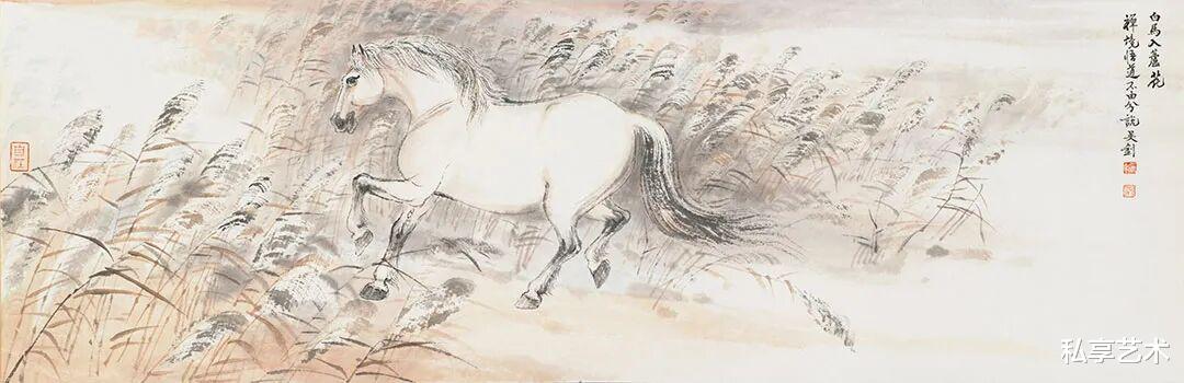 他笔下的马,不拘于形,而重在“气”。或独立寒汀,静若沉思;或跃入云岫,动若惊雷。墨色清润,线条简劲,既无繁饰之累,亦无躁动之气,只余一种内敛的奔放、沉静的自由。当马与梅枝相映、与芦花共舞、与远山同寂,便不再是物象,而是心象——是人在喧嚣尘世中对澄明之境的遥望。