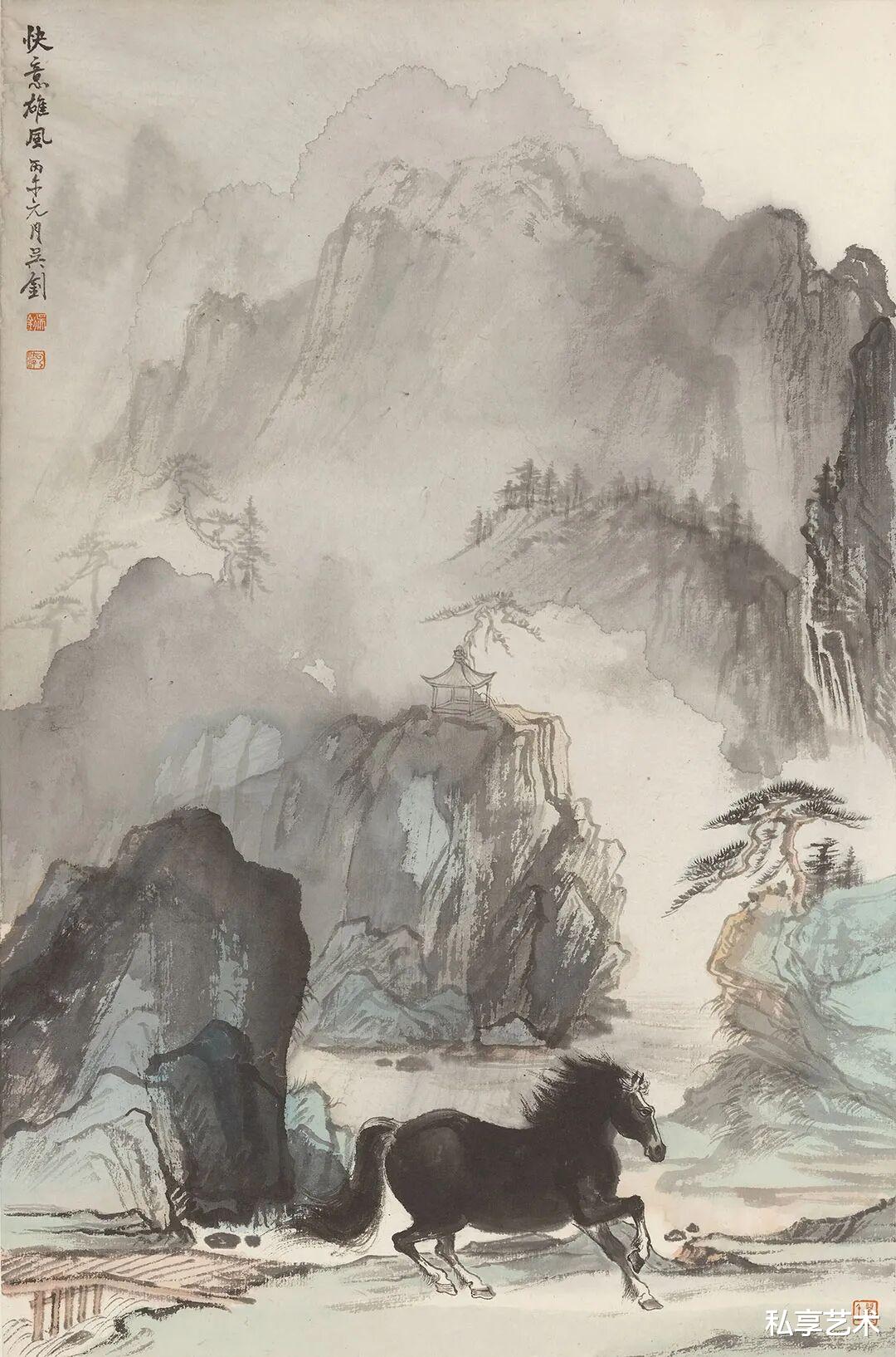 马,自古为天地间一缕奔腾的魂。它非仅四蹄生风,更是东方精神中“志”与“道”的化身——是“天行健”的刚毅,是“龙马精神”的昂扬,是文人心中不羁的风骨,亦是民间祈愿里吉祥的象征。吴钊以墨寄意,在山水烟云之间,让马成为贯通古今的诗意载体。