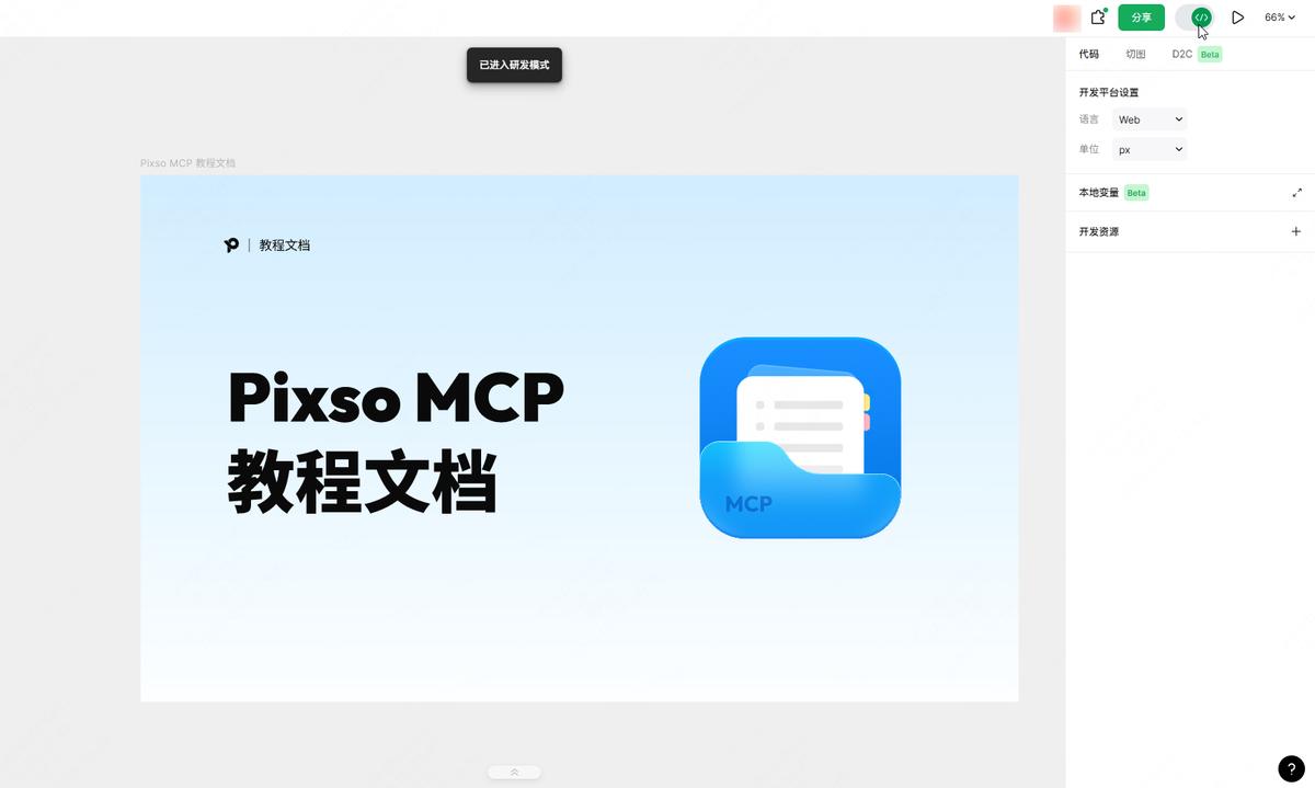 反观Pixso中的研发模式,对所有用户都是免费开放的,点击设计文件右上角的滑钮,即可进入研发模式,在研发模式下,点击右侧面板的“代码”、“切图”或是“D2C”标签,可以直接使用相对应的功能——