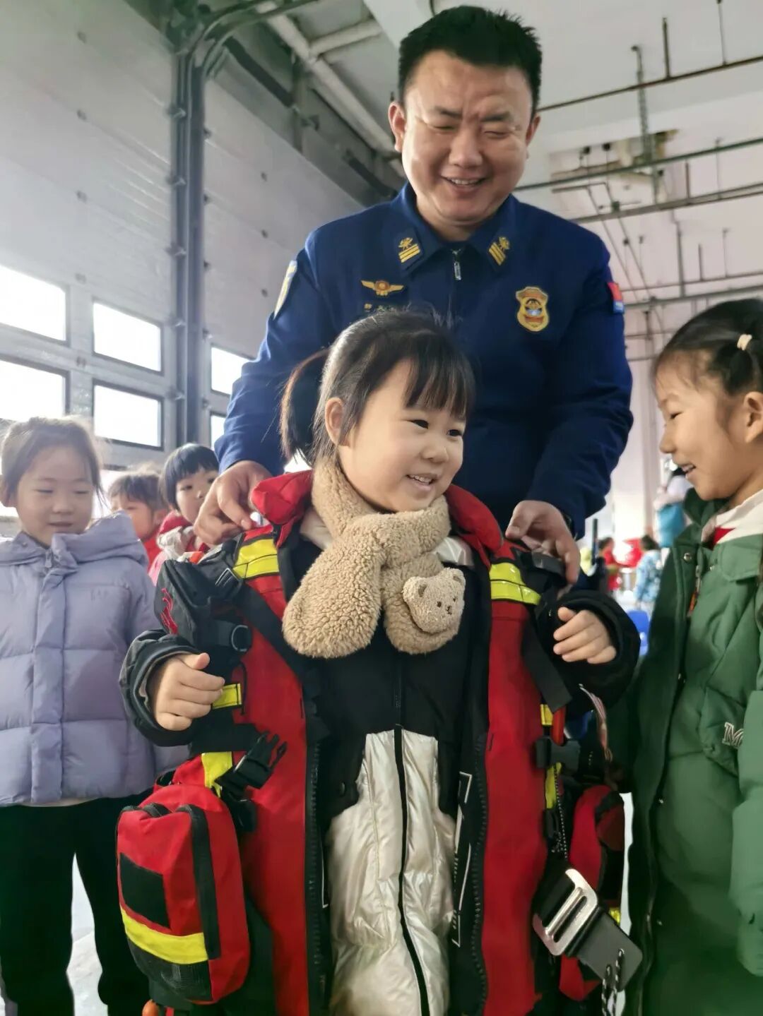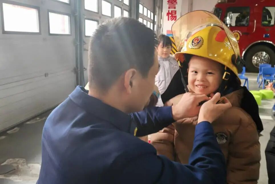 在装备室,消防员一件件展示他们的“武器”:破拆钳、热成像仪……当孩子亲手触摸到那厚重的防火服时,惊讶地发现:“这么重!穿上去走路都累。”