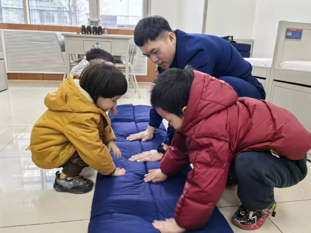 在消防员叔叔的示范中,孩子们看到了“豆腐块儿”的被子,体验后发现,叠被子也不是一件容易的事情。