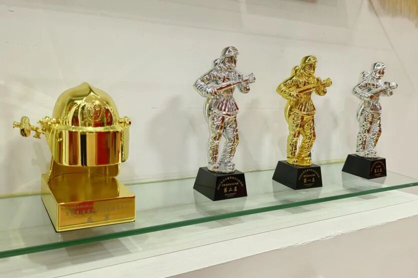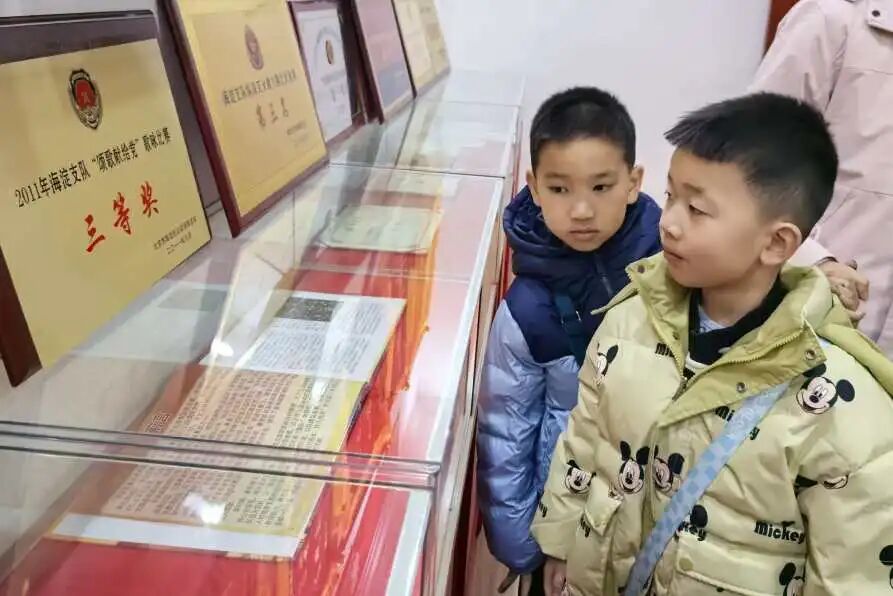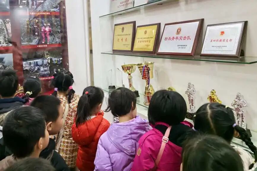 最让孩子们惊叹的是满墙的消防救援照片以及各种不同颜色、形状的奖杯和勋章,孩子们指着一个个奖杯问:“这是灭火发的奖杯吗?”