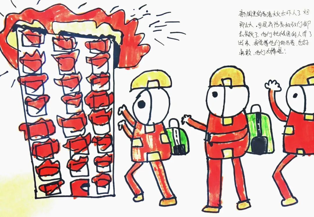 大一班夏宁晨:新闻里的香港大火太吓人了,烟那么大。可是消防员叔叔们都去了,他们把被困的人背了出来。我觉得他们好厉害,也好勇敢,他们太棒啦!