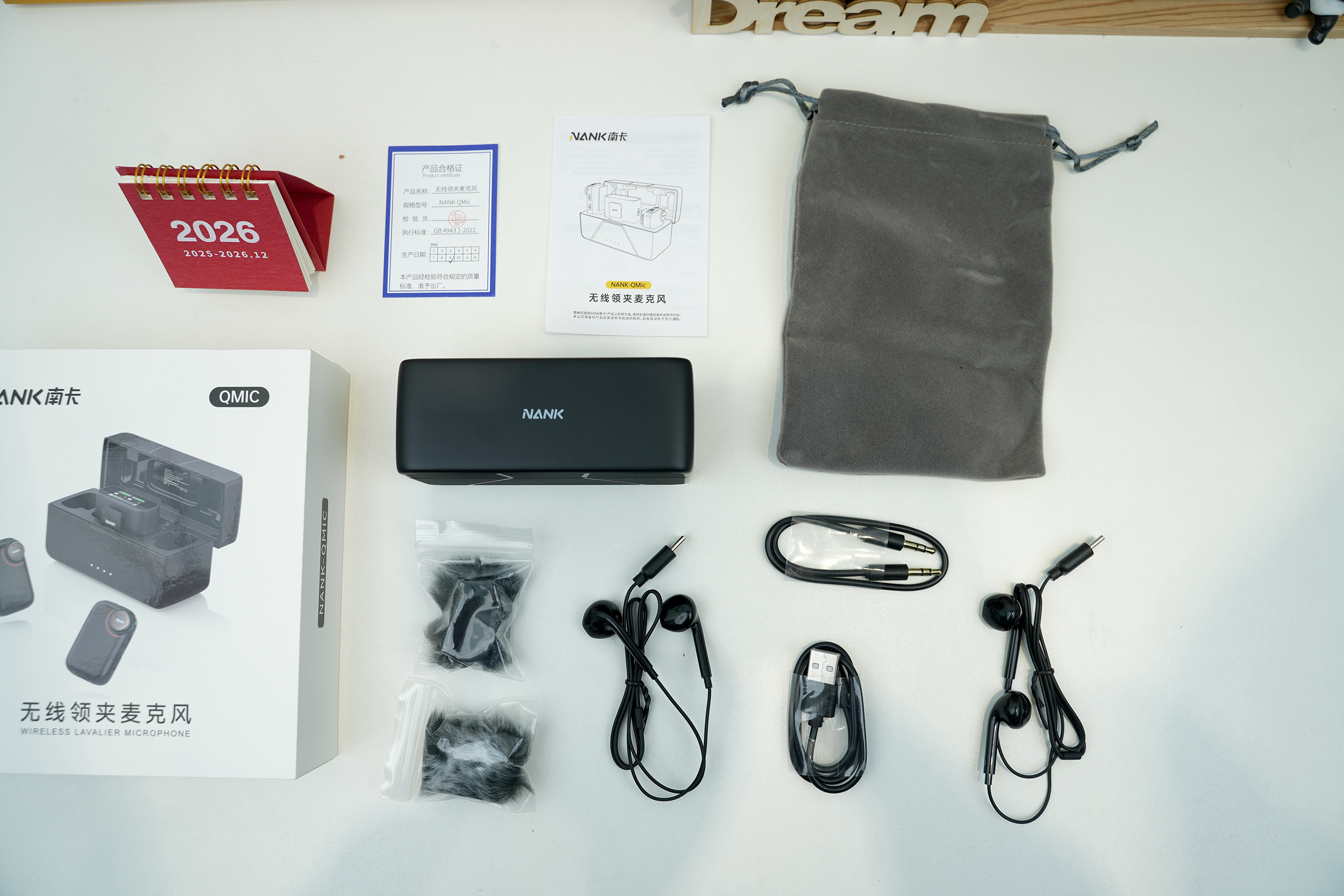 打开南卡Qmic的简约包装,配件的“慷慨”程度令人惊喜:除了充电仓,还包含了Type-C充电线、3.5mm音频线、防风毛套、监听耳机、绒布收纳袋一应俱全。这种“全场景适配”的配件策略,彻底解决了创作者外出拍摄时高效收音的配件需求。