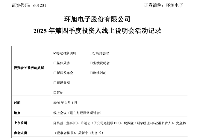 近日,环旭电子股份有限公司(证券代码:601231)举行2025年第四季度投资人线上说明会,公司董事长陈昌益、财务长吴新宇、光创联CEO许远忠等高管出席,向包括中信证券、中金公司、摩根大通在内的百余家投资机构披露全年经营情况。