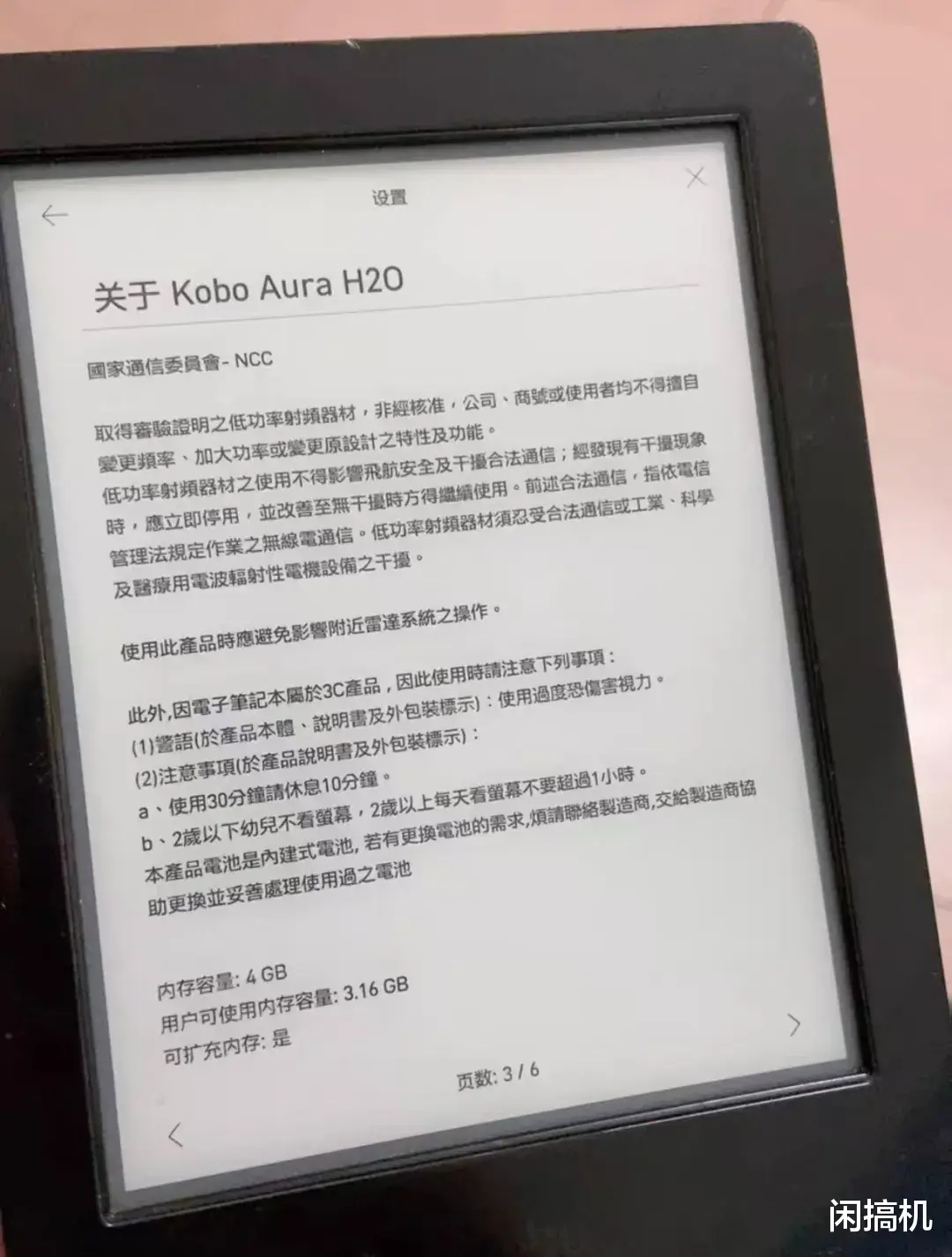 这是Kobo的aura H2O电纸书,Kobo原本是加拿大公司,后来被乐天收购了。它采用6.8英寸墨水屏,支持触摸操作,PPI是256,自带4G存储容量,好像还有8G高配版?支持TF卡扩展。