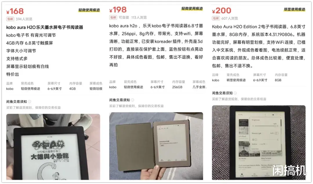 最后是价格,当年全新是1200元左右,如今二手最低168元,在200元内都合理。但电纸书很容易吃灰,跟无人机、VR眼镜等产品一样是“吃灰榜”常客,大多数沦为“盖泡面”的命运,非刚需别上头。