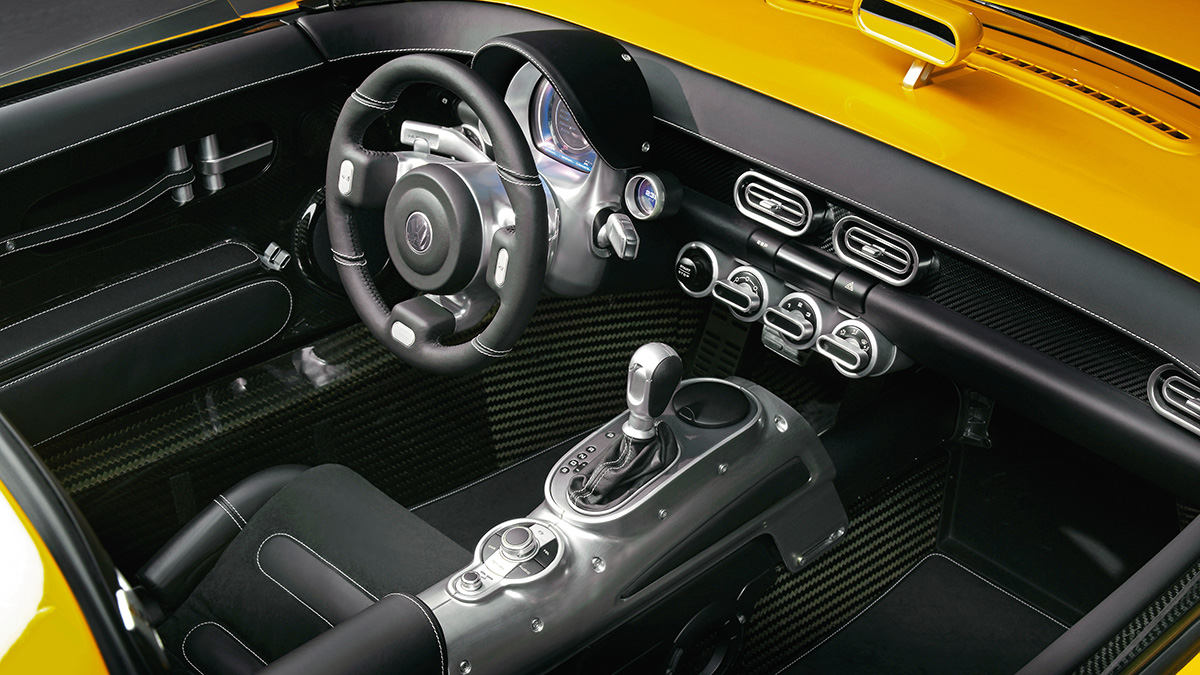 EcoRacer最令人印象深刻的工程创意,在于其模块化的车顶设计。驾驶员可以通过拆除硬顶将其从轿跑改为敞篷跑车,进而再拆除前挡风玻璃及其框架,将其变身为风挡极简的老式"竞速车"(Speedster)形态,三种驾驶风格集于一身。内饰设计同样超前:仪表台极度简洁,所有显示信息集中于主仪表组内,这一思路与后来奥迪"虚拟座舱"的设计理念如出一辙。