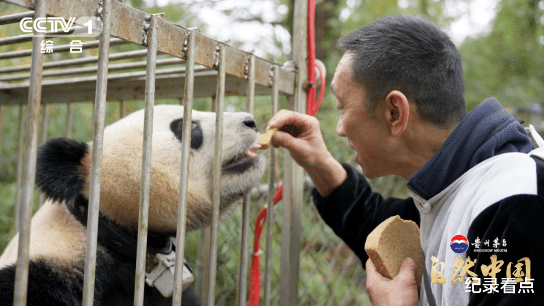 △野化基地工作人员牟仕杰给熊猫妈妈喂食