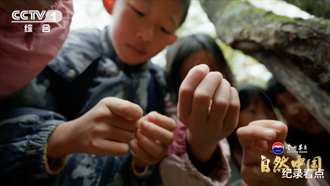 △“看,这是野生扭角羚的毛!”孩子们在树皮上发现了野生动物的痕迹