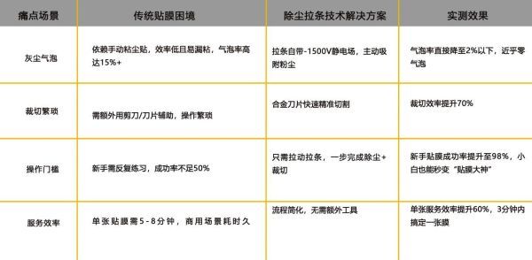 当你小心翼翼贴完手机膜,却发现屏幕藏着灰尘气泡。当除尘贴膜只能用剪刀笨拙裁切时,效率效果都让操作人员头疼。这些让无数人头