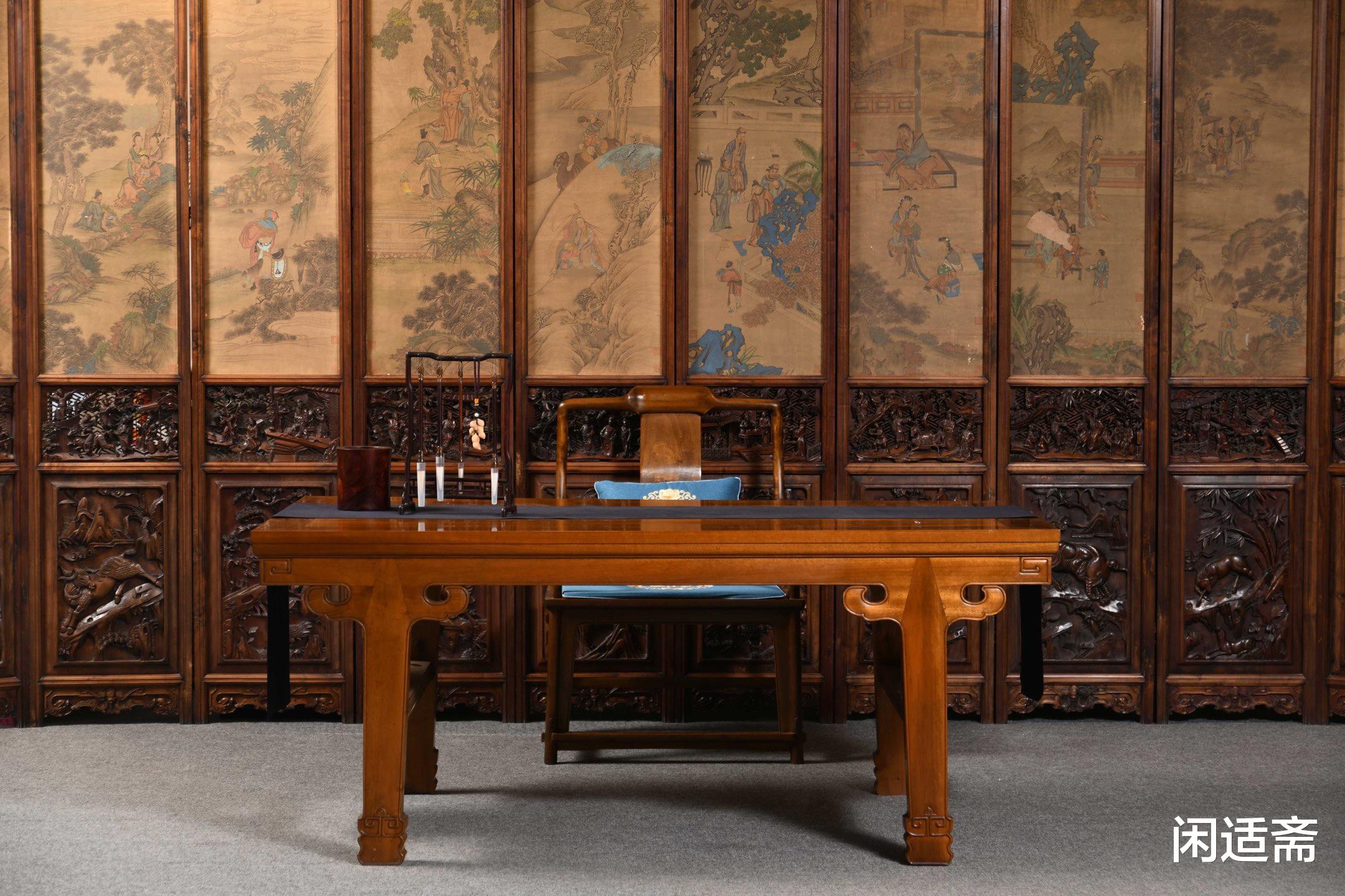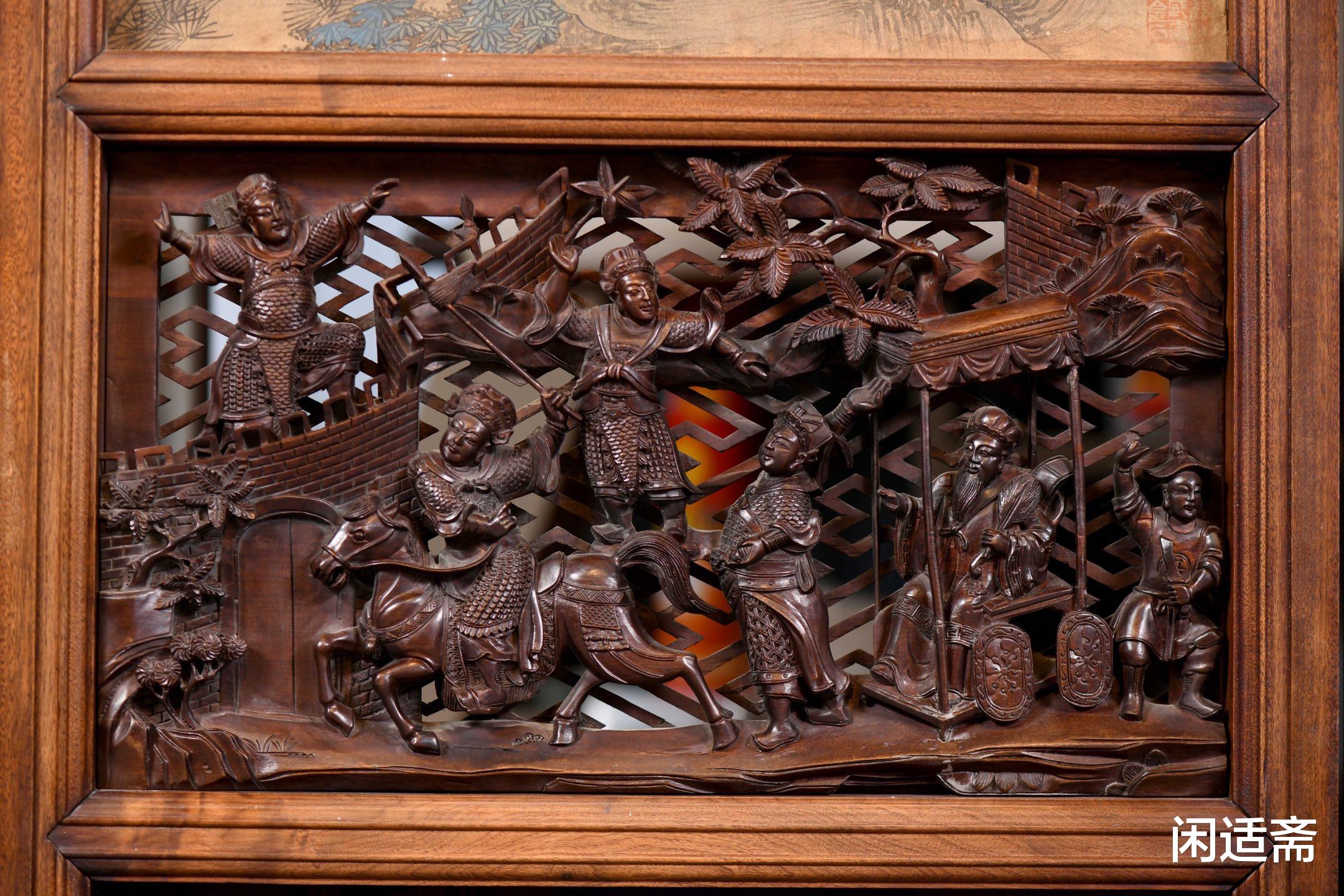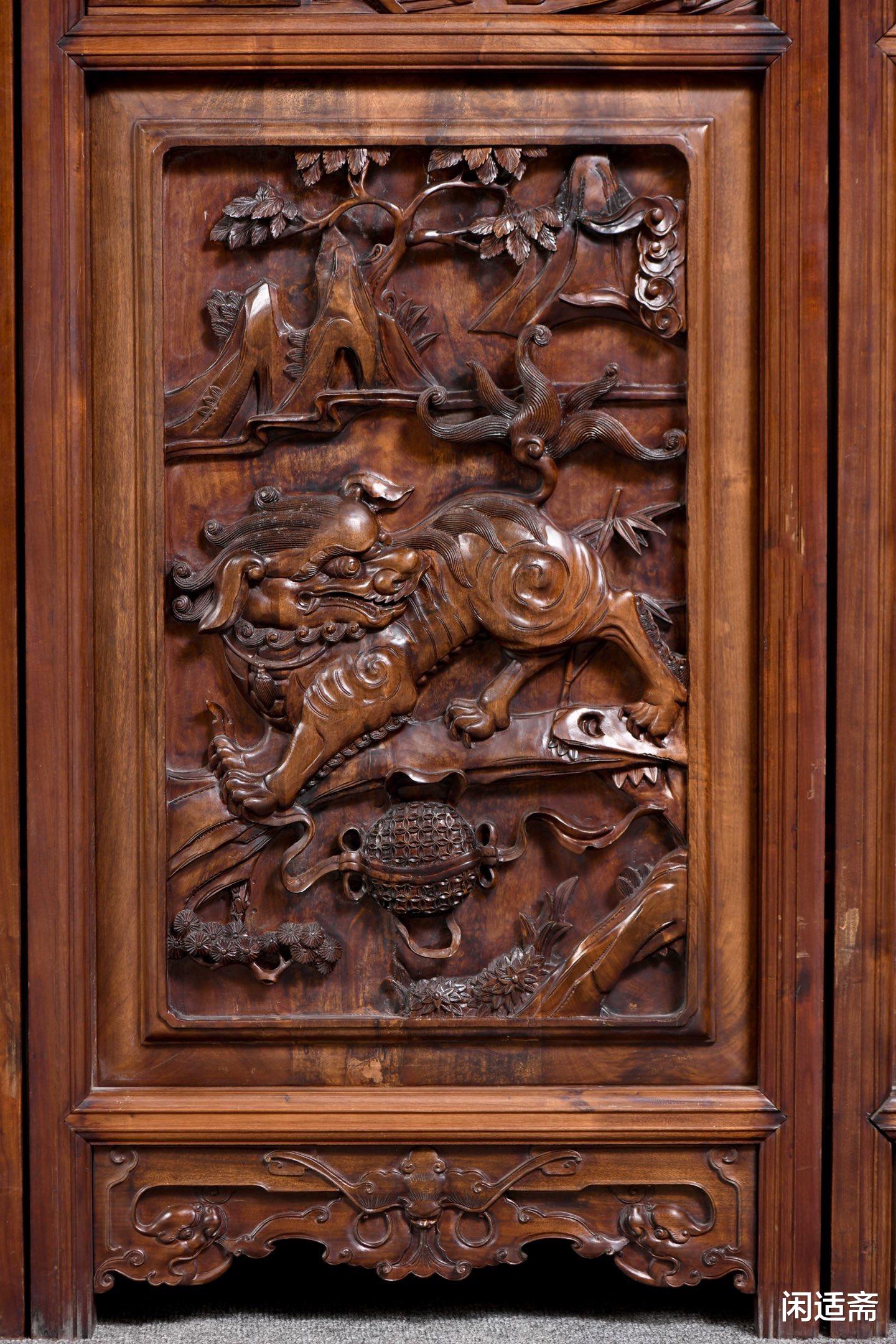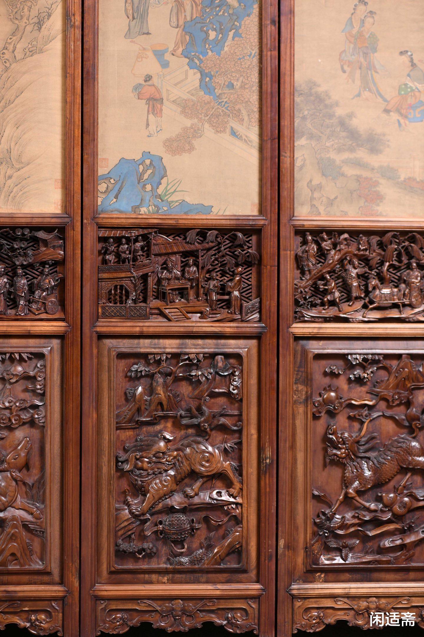围屏做工精湛,集书画与雕刻工艺为大成者,细节之处尽显匠心。上边框以手工浮雕工艺,精刻十二幅文房清供图,笔墨纸砚、琴棋书画皆栩栩如生,尽显文房雅韵;接绢画下沿,雕刻有十幅叙事典故图,人物神态生动、场景刻画细腻,兼具观赏性与文化内涵;下边框则刻有十二幅神兽图,造型威严、线条流畅,承载着古人对吉祥安康的美好祈愿,三重雕刻工艺相辅相成,将传统雕刻艺术的精湛展现得淋漓尽致。