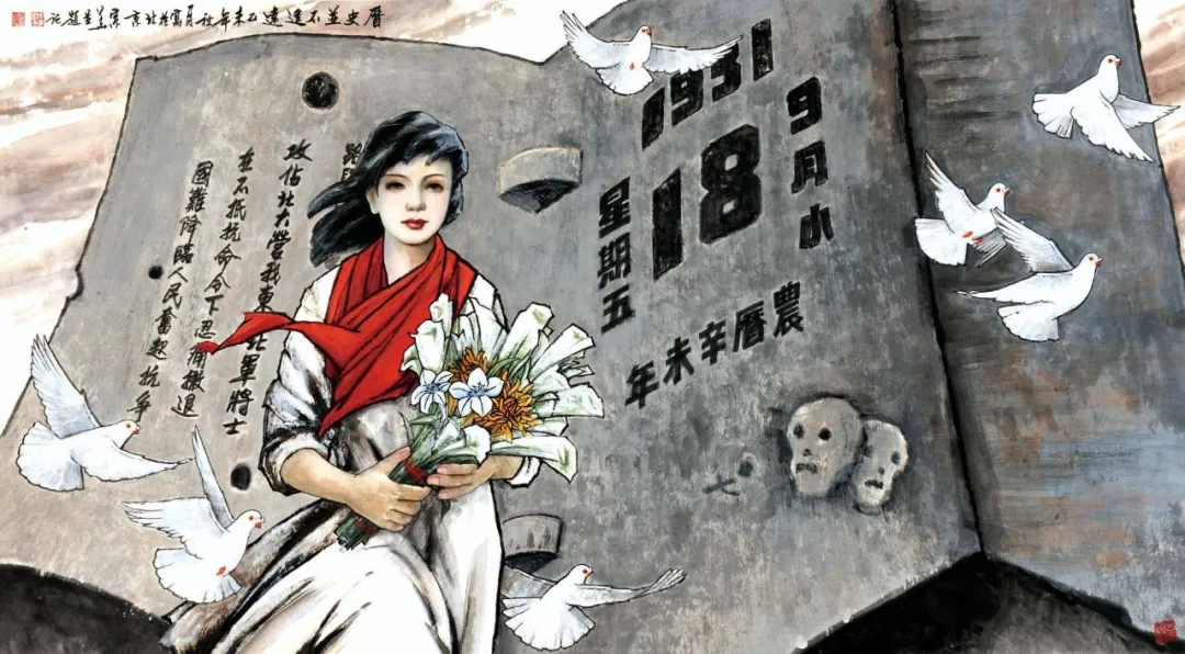 宗华表现一代伟人的水墨人物画,即体现了现代水墨人物画的写实性特征,又继承了传统人物画的那种假定性与抒写性。在借鉴传统方面,他把写实的富有个性特征的人物形象设置在海潮、激流、山岳、松柏、丛梅之中,以此表现领袖人物的性格心理、人格品德。而且、这些景物的描绘多以超宽的构图展开,从而使他对领袖人物形象的塑造呈现出气势磅礴,场面壮阔的象征性景观。这些景物的描写无疑具有某种假定性,但这种艺术的假定性却赋予人物性格的真实性。在古装仕女画作品中,他并不是单纯地画仕女,而是通过古典诗词中的香草美人形象,表达文人对于理想情感的寄寓和对于现实社会的哲思。他的古装仕女同样注重寓意空间的营造,不论是雨打芭蕉、风荷莲藕,还是大漠孤烟、寒林雪景;也不论是春江花月、秋水瘦菊,还是清泉石流、疏影横斜,那些作品也都因景物的描写而拓宽了人物的精神世界与画面的审美内涵。特别是超宽的广角镜式的构图,使恢宏的画面产生了比小品更加浓厚丰富的主题意蕴。这些作品,滤除了西式的素描造型方式,而纯以传统文人笔墨表现,线的流畅洒脱和墨的浓淡渗化被富有意味地融合为一体。