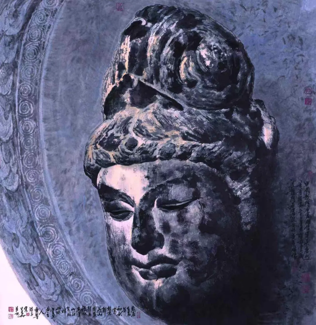 宗华的作品以人物画为主,在人物画的天地里,他有画佛像题材的探索和成绩。我被他画的唐代佛像吸引!这件作品画得相当饱满,笔墨塑造古典安详的氛围很到位。用笔勾线非常准确,色彩渲染也显得滋润。巧设淡青,层次丰富。佛像画得很庄严,并不都是古董般的陈旧感,而是借助素描的良好功底,把佛像置于笔墨与光影的双重框架内,画出了中西结合的创新效果。一支普通的画笔,一砚湮水的青墨,在浓淡干湿焦的层次与明暗立体感相互补充,石塑佛像画得形神兼备,尤贵有神!这是很了不起的现代中国水墨造型新成果,可以当成一个美学标本深入研究。