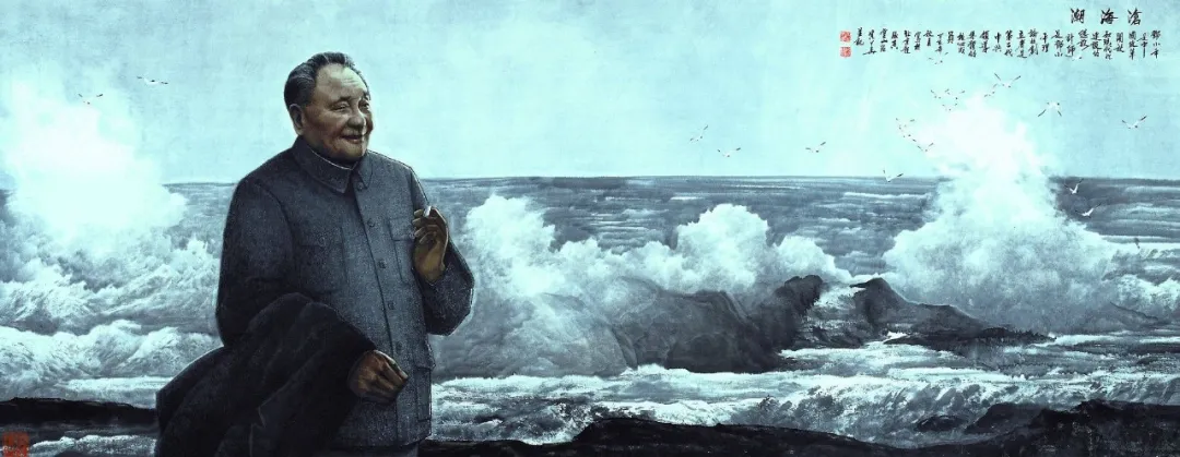他的水墨人物画可分为两大类:一类是开国领袖形象的塑造,把一代伟人领袖形象的个性化刻画与自然环境的象征性描写巧妙地结合起来;另一类则是把非个性化的古代香草美人与寓意性背景的铺叙相结合,体现出像屈原《离骚》、《橘颂》那样通过香草美人的形象符号表达艺术主体的现实感怀与历史寄予的隐喻方式。在伟人形象的个性化塑造上,他综合了我们熟悉的伟人经典性形象,即注重领袖那种博大胸怀与聪敏智慧的发掘,也注重领袖那种亲切和蔼的人格魅力的捕捉。在艺术语言上以素描式的水墨为主,造型坚实,刻画细微,体现了作者较为扎实的写实功底。