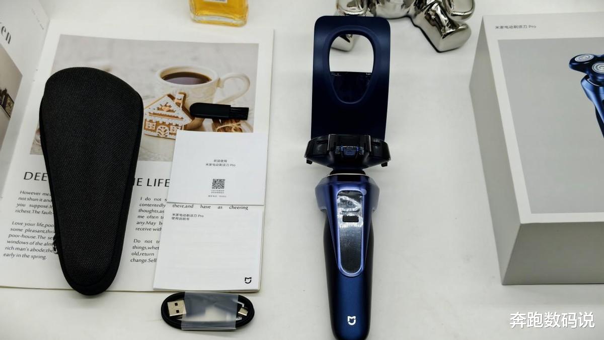 配件清单十分齐全:剃须刀本体、Type-C充电线、清洁毛刷、便携收纳包、专属桌面支架,以及图文清晰的说明书和快速指南,即使是新手也能秒上手。值得一提的是,支架底部加装了防滑橡胶,摆放时稳固不晃动,既能晾干机身,又能作为卫生间的装饰,实用性与颜值兼顾。