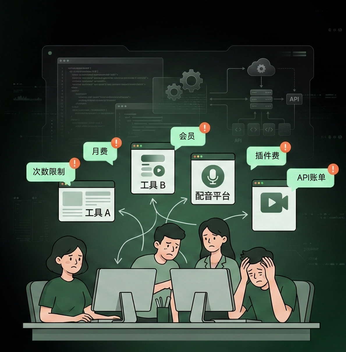 做电影解说的人应该都经历过这种烦躁——电脑上装了一堆软件,写文案一个、配音一个、剪辑一个,素材在工具之间导来导去,光等加载就半天。换一台电脑还要重新配环境,出差根本没法干活。