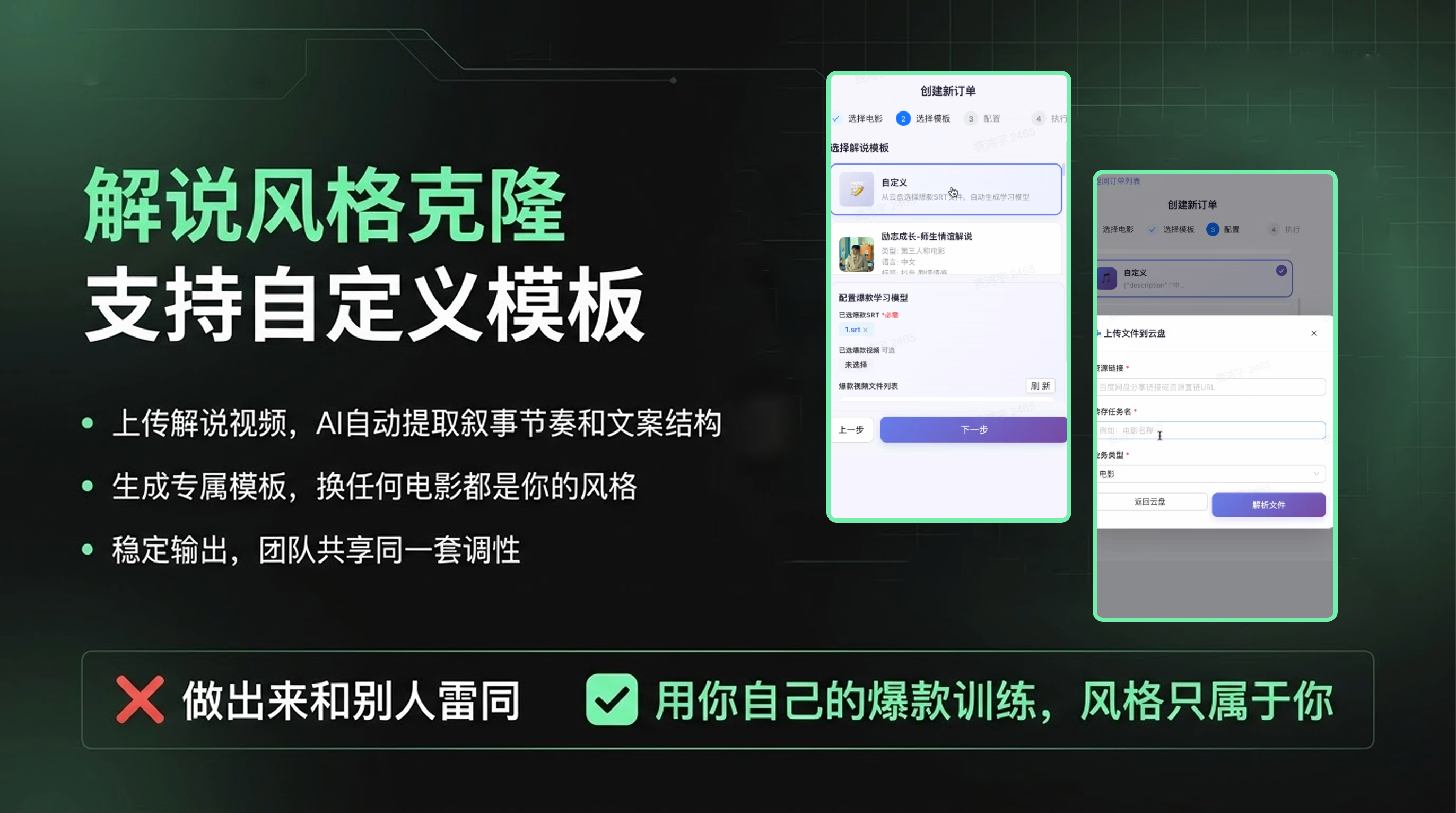 风格克隆的逻辑很简单:你把之前数据好的爆款视频上传,AI自动分析你的叙事结构、用词习惯和节奏偏好,生成一套只属于你的模板。之后换任何电影,输出的风格都是你的调性。