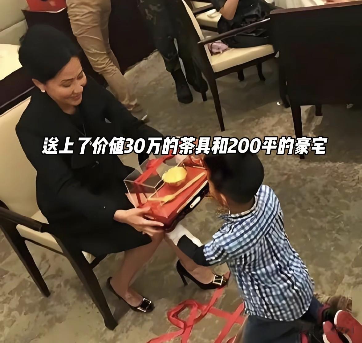 刘嘉玲更是用干妈身份当场送出价值30万纯金茶具与200平豪宅作为厚礼。