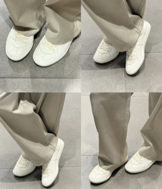 想要把这对“王炸”穿好看,关键在于裤长与鞋型的匹配。对于面料挺括的西装裤或工装裤,可以选择鞋底有一定厚度的复古款小白鞋,既能撑起裤管的量感,也能避免拖地带来的拖沓。而若是垂感极佳的针织阔腿裤,则更适合线条简洁的经典款小白鞋,让裤脚自然轻拂鞋面,走起路来带风。
