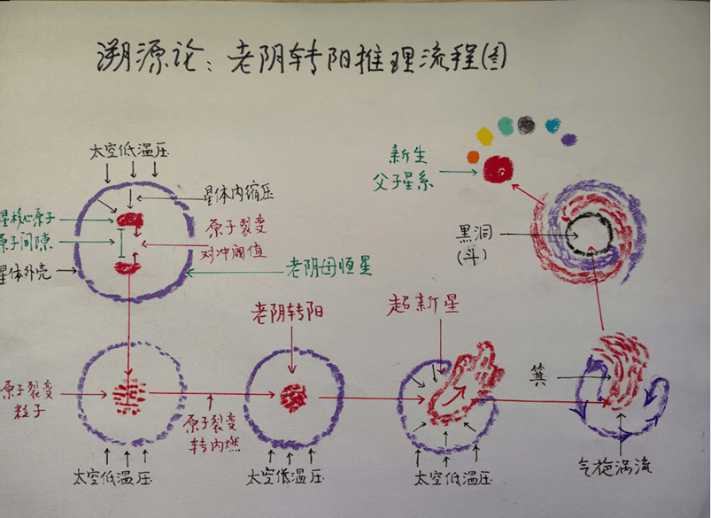 老阴母恒星从星体本身,与所处的宇宙空间。都是极其寒冷负高压[-1000度以上]。母恒星在负压的趋势下进行冷缩。巨大星体的冷缩压。使星体内部的原子间隙受压逐渐缩小。星体内部大的原子。最终在巨大的冷缩压作用下。发生碰撞。这种原子互相碰撞达到一定阈值[物理原子对撞裂变阈值]。原子发生裂变---粒子。这种原子裂变区域逐渐扩大。最终转变形成内燃。老阴转阳的过程,实质是物理原子。在收缩压作用原子裂变成粒子的流程。巨大的天体阴阳演变。确是由最小的原子裂变粒子程序完成。