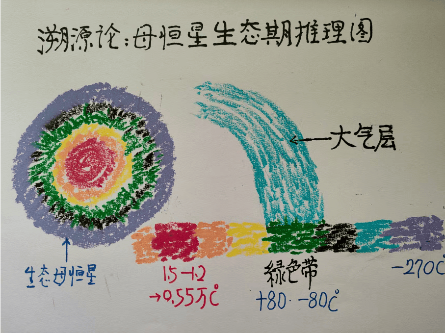 M恒星的生态期。是星体外壳逐渐冷却形成。赤橙黄绿青蓝紫状态时。绿色带就是生态区间。并围绕生态区的温度而形成环形大气层。构成外星祖先生存的生态区域。生态区域随温度而移动改变。