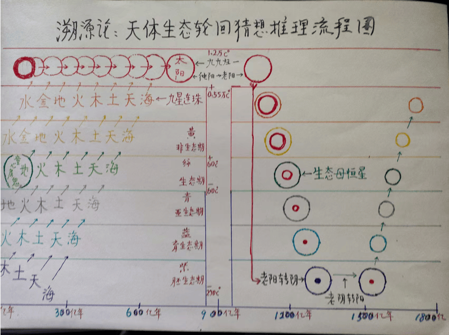 天体生态轮回。是以星系轮回为主体。以太阳系为例。根据现代太阳系的天文形态。轮回程序是。1.九星连珠。2九星归一。3老阳转阴。4老阴转阳。5超新星。6新星系胚萌期[黑洞期]。7.新父子星系形成。轮回时间约为1,800余亿年[地球年]。太阳系绕银河系一周约2.4亿年。相对应地球的24节气[每千年为一节气。][1,800亿年的理论依据。人的标准寿命是一蔀[易经;丰,丰其蔀76年。地球绕太阳76周。而太阳系要银河系核心一周约2.4亿年。一蔀76周。所以星系轮回时间预约1800余亿年。2.4亿年,即24千万年,同对应地球24节气]