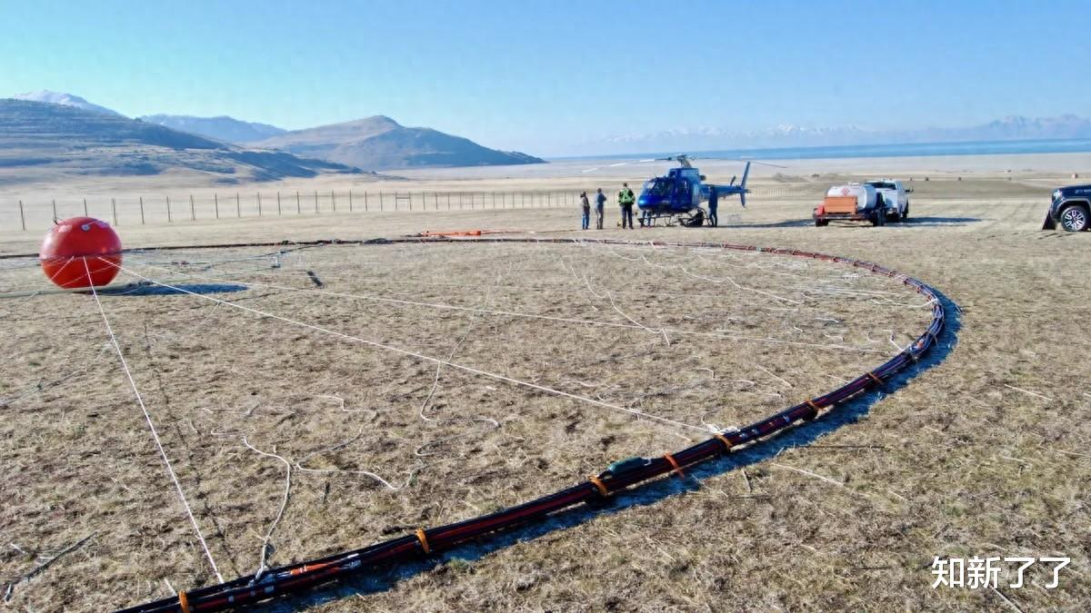 为探究土丘下方的地质结构,日丹诺夫团队在大盐湖10平方英里(25平方公里)范围内进行了航空电磁勘测。在Expert Geophysics公司协助下,研究人员利用直升机悬挂环形装置,在湖泊上空沿长线向下发射电磁脉冲。装置中心悬浮的球体接收回弹信号,通过软件解析数据绘制湖底淡水沉积层分布图。