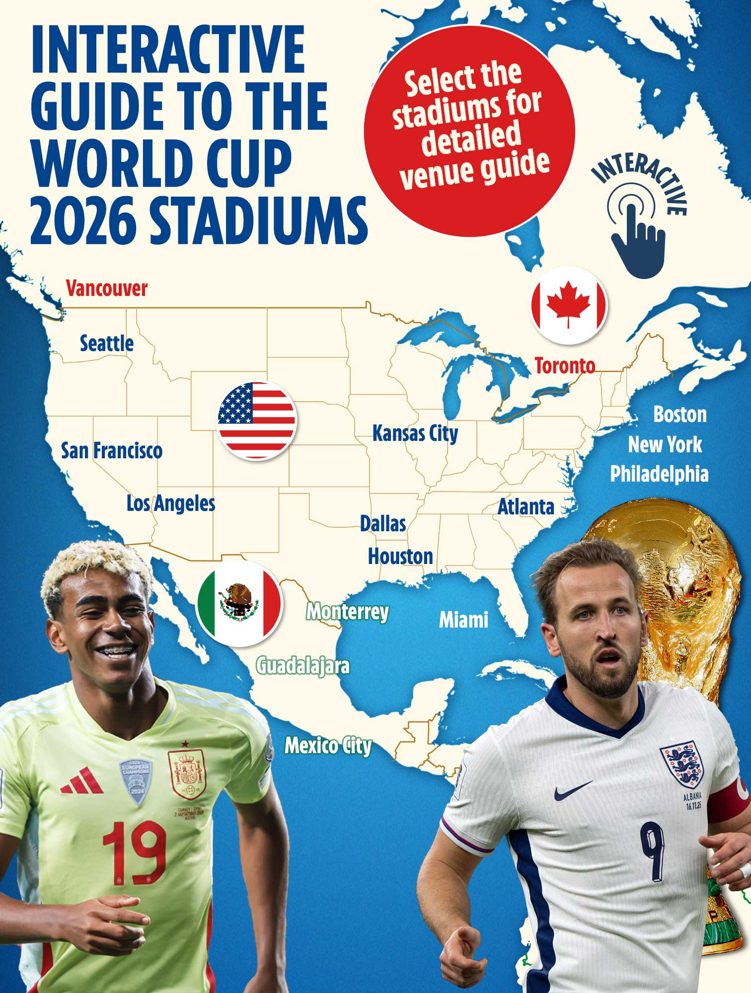英格兰队预计将在6月10日于伊蒂哈德球场开启征程,如果晋级淘汰赛,16强战很可能在纽卡斯尔的圣詹姆斯公园球场进行。