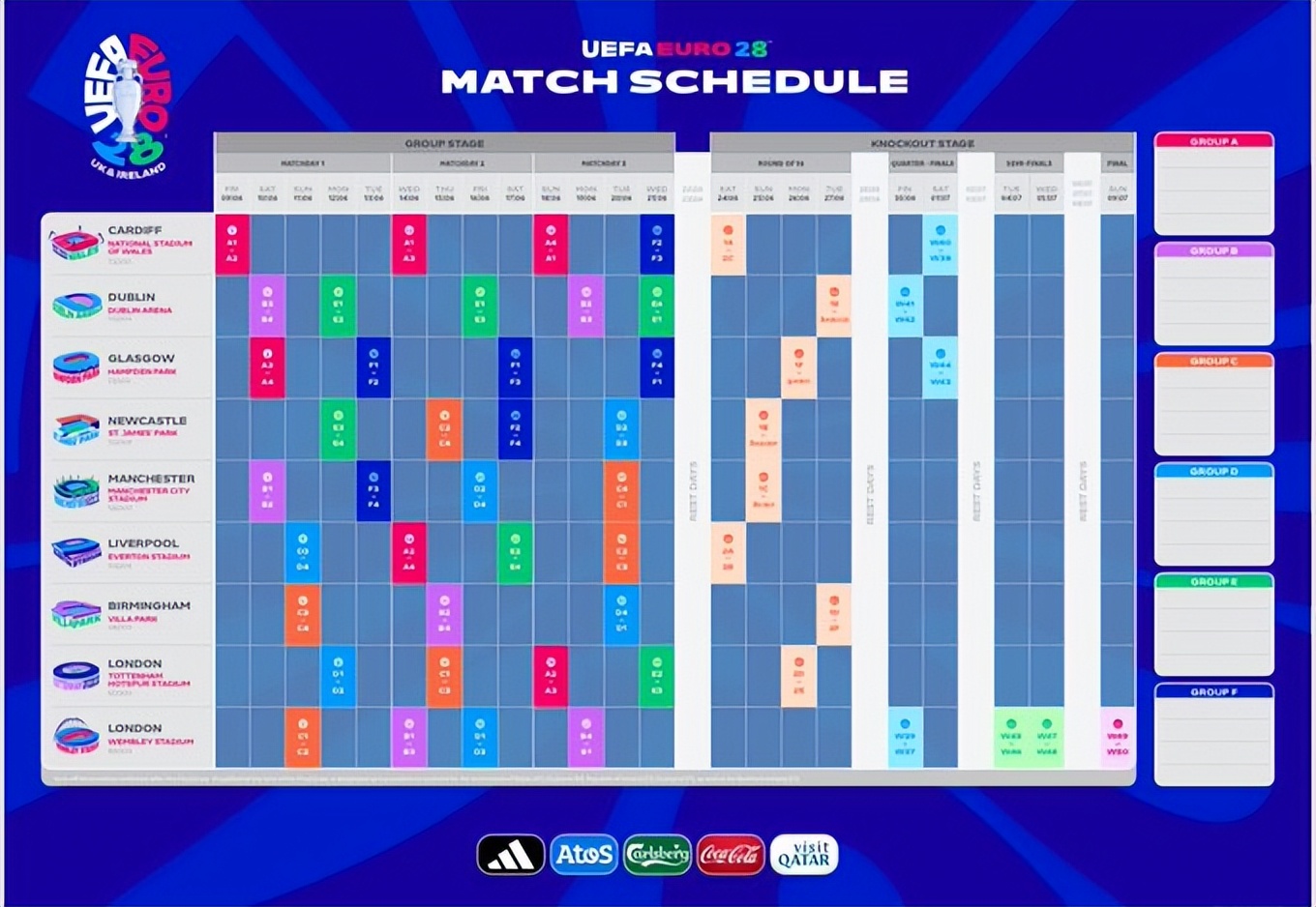 2028年欧洲杯将由英国和爱尔兰联合承办,比赛将在多个标志性球场进行: