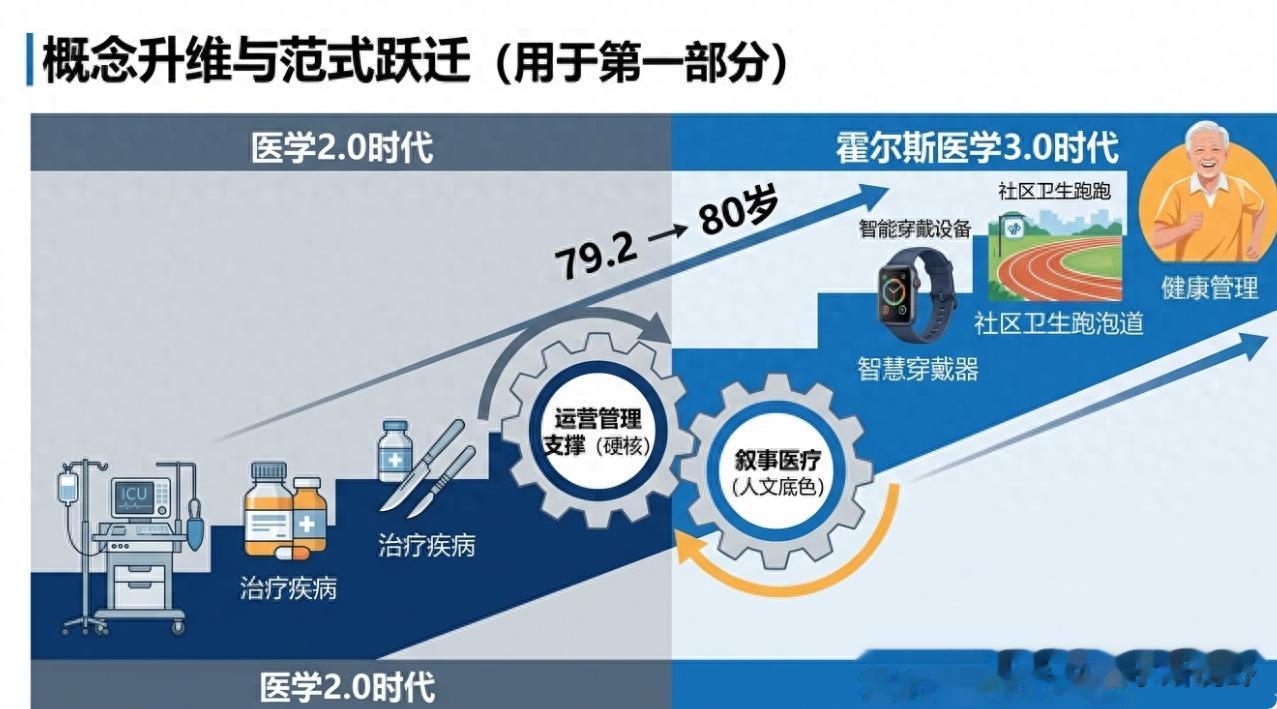 一、 认知升维:从治已病到 霍尔斯医学3.0与叙事医疗的交响要实现人均预期寿命的历史性突破,单靠传统医疗模式增加床位、堆砌设备已经触及天花板。基于多年的行业深耕与模式研究,我们正式提出“霍尔斯医学3.0”时代战略,并将叙事医疗作为其核心的人文底色,共同驱动医学3.3落地管理体系。